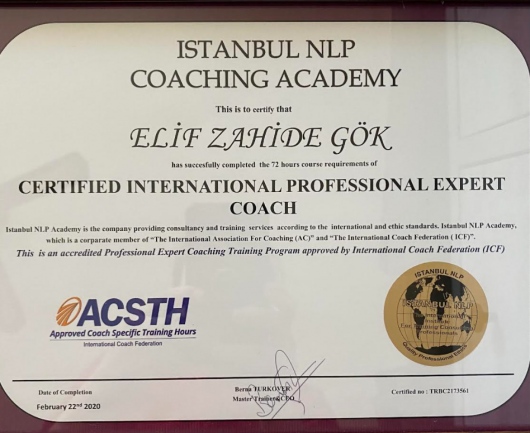 Ayrıca Yeditepe Üniversitesi’nden aldığı eğitimlerle, uluslararası geçerli ve akredite, ICF onaylı profesyonel uzman koç olarak, danışanlarına kendi potansiyellerinin farkına varmaları ve geleceğe dair daha sağlıklı planlama yaparak, kendilerini gerçekleştirmeleri için çalışmaktadır.