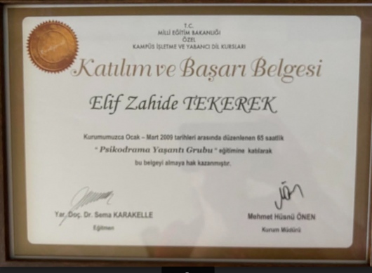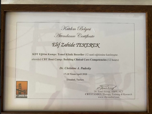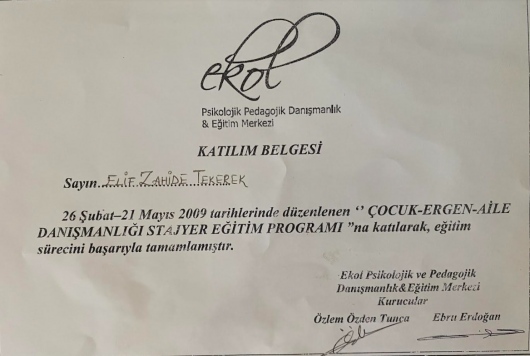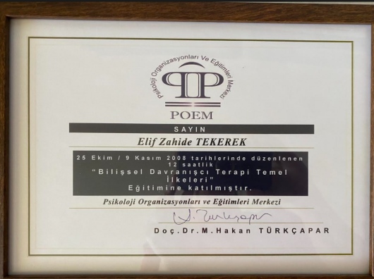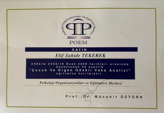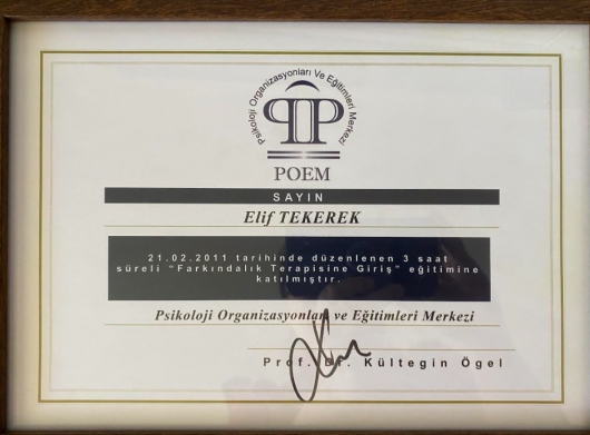 Yetişkinlerle olan çalışmalarına Bilişsel Davranışsal Terapi, Farkındalık Terapisi, Psikodrama, Deneyimsel Tasarım Öğretisi-İletişimde Ustalık, Pozitif Yaşam Becerileri Eğitim Programları eğitimleriyle devam etti. Ayrıca Rorschach testi, T.A.T, Beck Depresyon ve Anksiyete testleri gibi yetişkinlere uygulanan testlerin uygulayıcı eğitimlerini aldı.